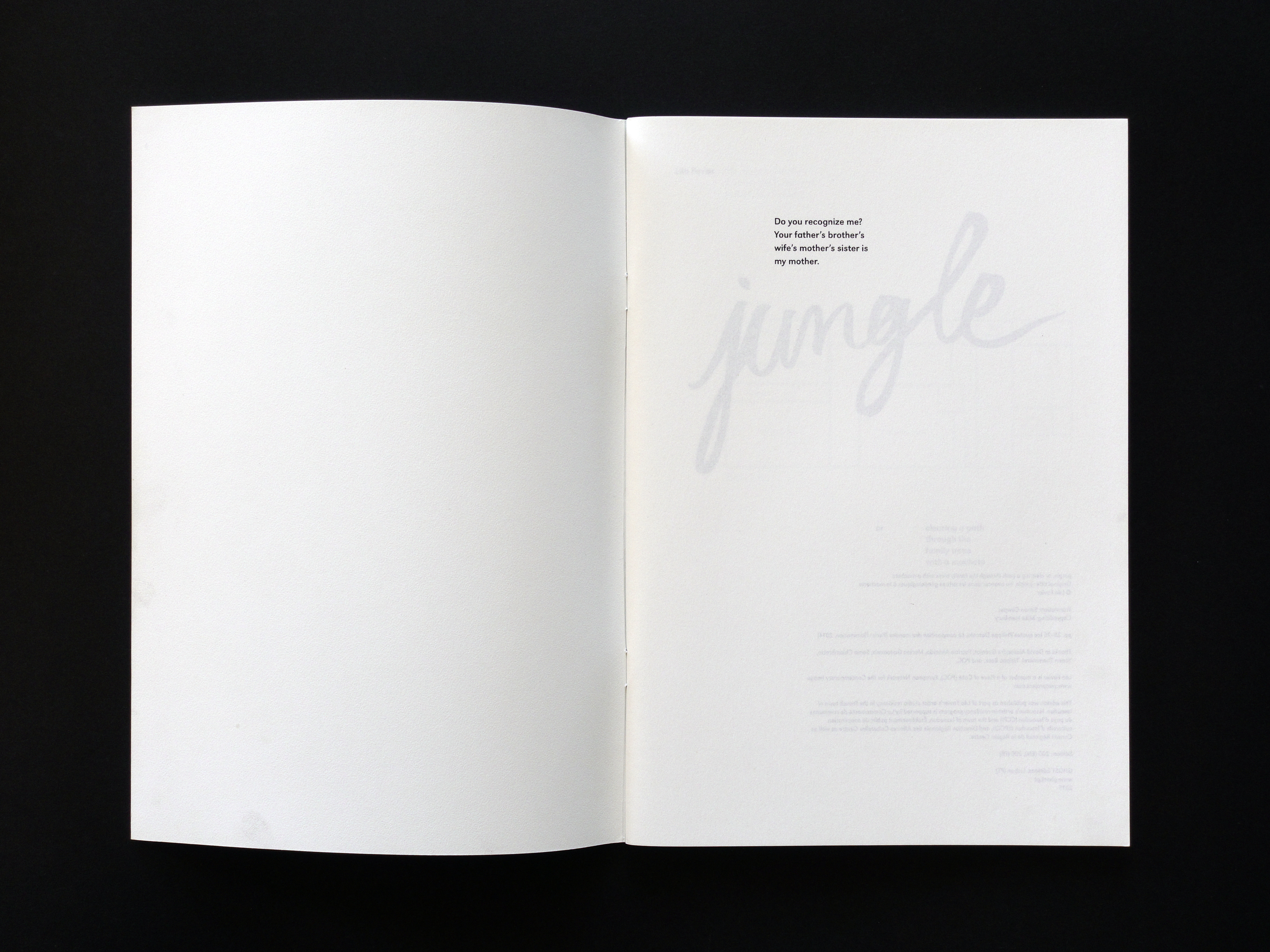 É véspera de Natal e é a última vez que a família se reunirá na quinta do avô. Dentro de algumas semanas, será vendida. Durante o jantar, os convidados contam histórias, comentam a comida, e discutem a questão da herança. Até que é tempo de abrir os presentes. Jungle, ou avancer dans les arbres généalogiques à la machette [selva, movendo-se através das árvores genealógicas com uma catana] mostra como uma família constrói a sua história e espalha a sua própria cultura entre os seus membros. À maneira de um story board, o livro utiliza de forma original e inédita vários modos de narração e descrição, desde texto e ilustração até planos e modelos arquitectónicos.
