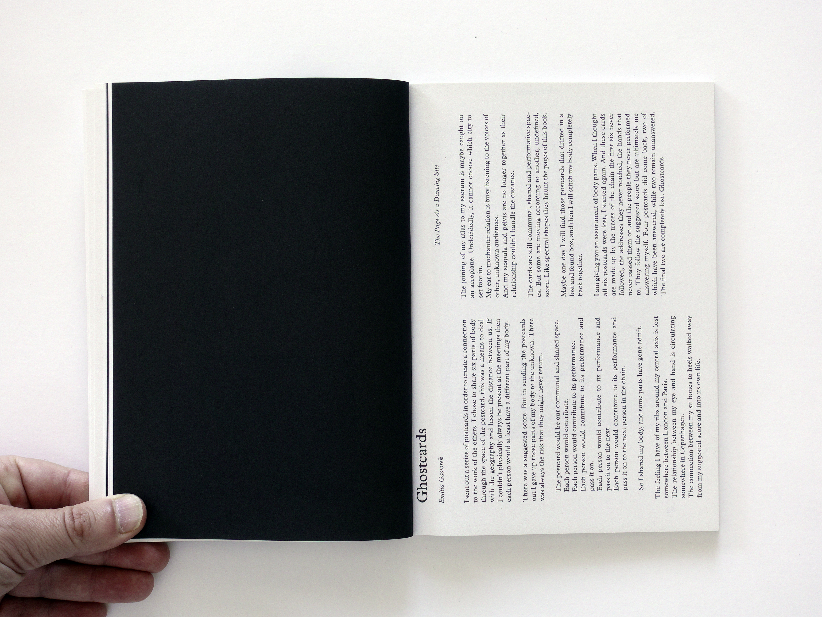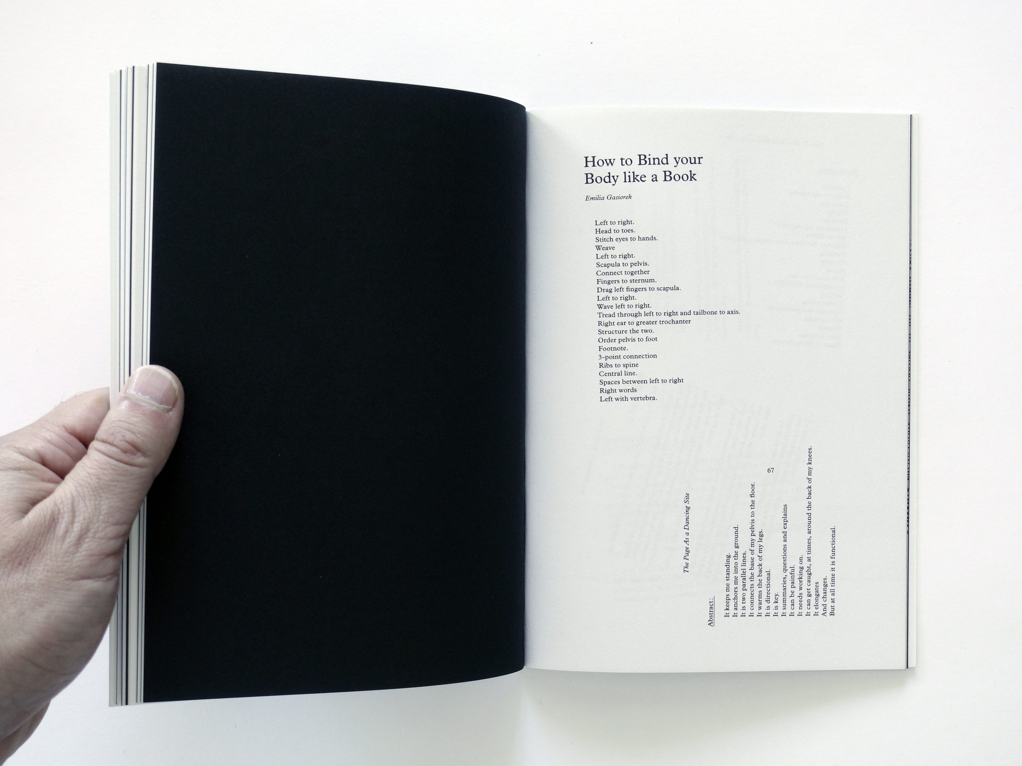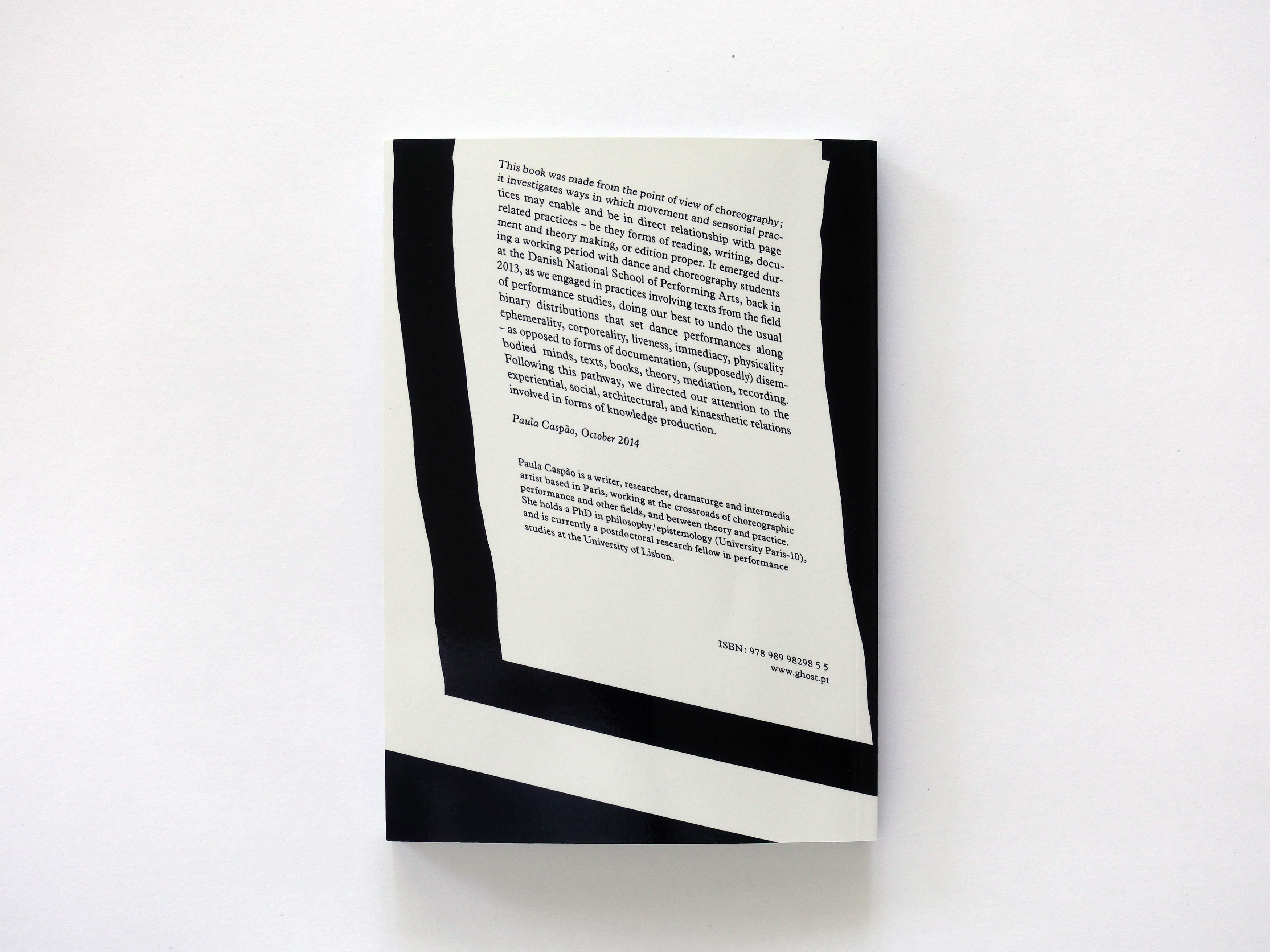 “This book was made from the point of view of choreography; it investigates ways in which several movement and sensorial practices may enable and be in direct relationship with page related practices – be they forms of reading, writing, document and theory making, or edition proper. It emerged during a working period with dance and choreography students at the Danish National School of Performing Arts, back in 2013, as we engaged in practices involving texts from the field of performance studies, doing our best to undo the usual binary distributions that set dance performances along ephemerality, corporeality, liveness, immediacy, physicality – as opposed to forms of documentation, (supposedly) disembodied minds, texts, books, theory, mediation, recording. Following this pathway, we directed our attention to the experiential, social, architectural, and kinaesthetic relations involved in any form of knowledge production.”