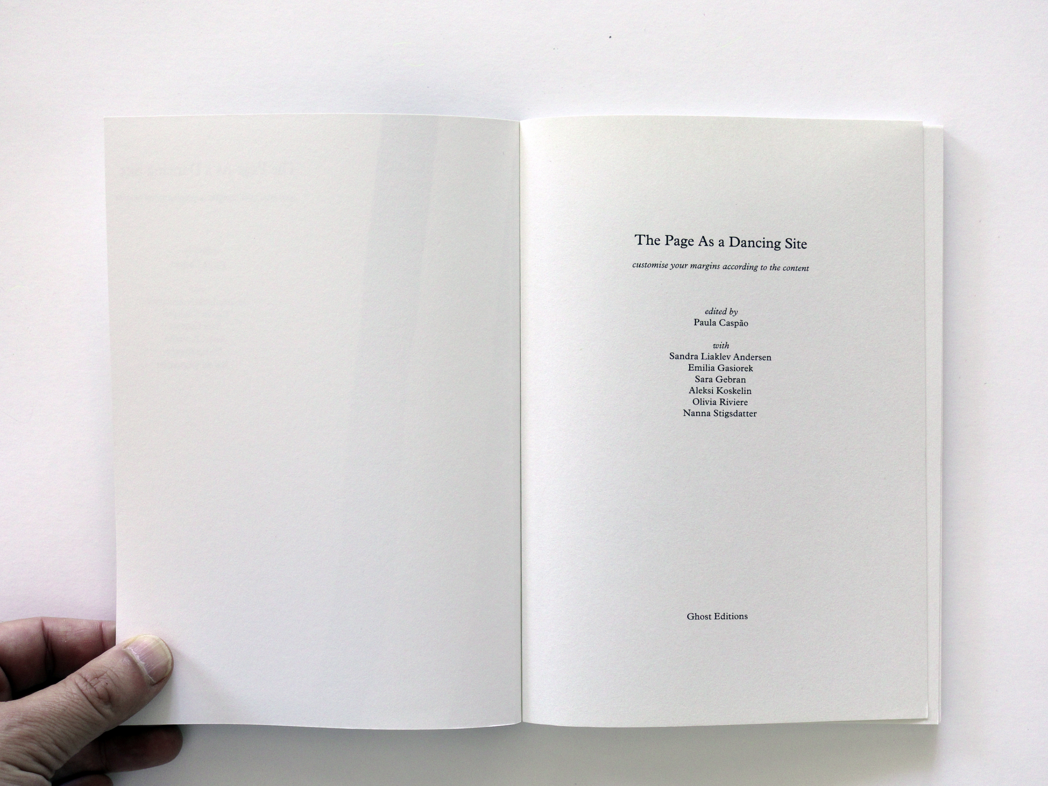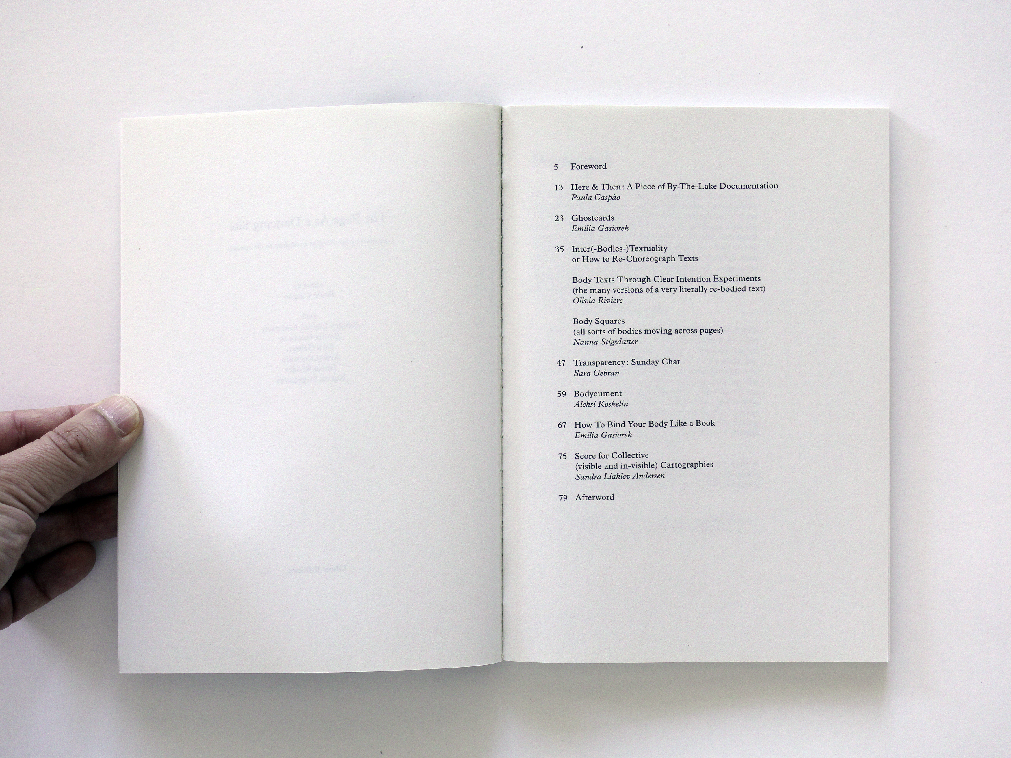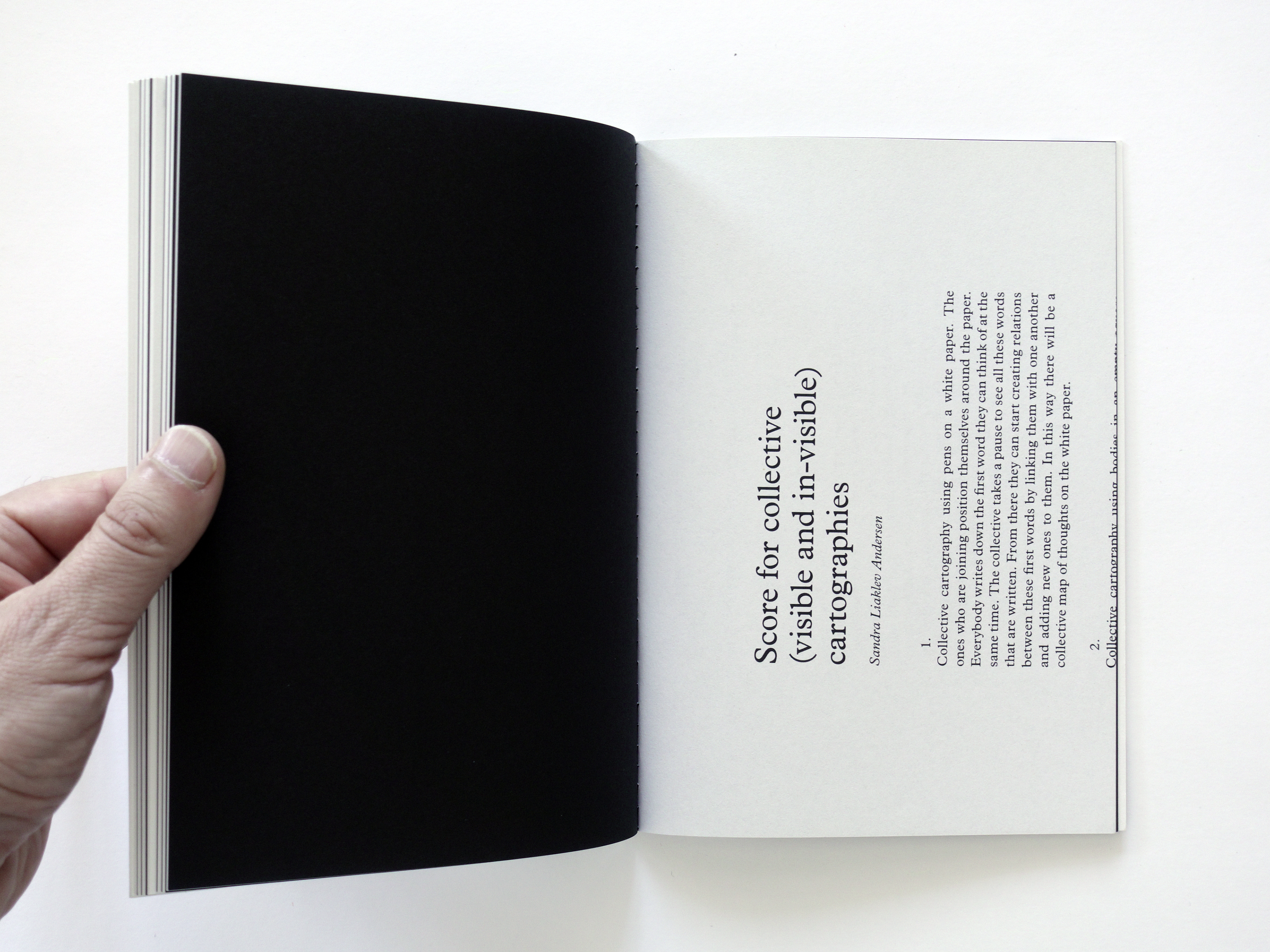 “This book was made from the point of view of choreography; it investigates ways in which several movement and sensorial practices may enable and be in direct relationship with page related practices – be they forms of reading, writing, document and theory making, or edition proper. It emerged during a working period with dance and choreography students at the Danish National School of Performing Arts, back in 2013, as we engaged in practices involving texts from the field of performance studies, doing our best to undo the usual binary distributions that set dance performances along ephemerality, corporeality, liveness, immediacy, physicality – as opposed to forms of documentation, (supposedly) disembodied minds, texts, books, theory, mediation, recording. Following this pathway, we directed our attention to the experiential, social, architectural, and kinaesthetic relations involved in any form of knowledge production.”